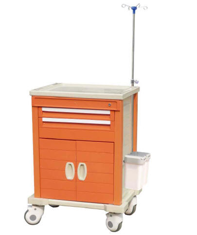 ABS body, metal ball bearing rail, E-aluminum columns, F-plastic-steel columns, IV pole, dust basket, utility container, file bag, sliding side shelf, concave top covered with transparent soft plastic glass, centralized lock, 1 small and 1 big drawer and door, inner with partitions can be well organized drawer reppositioned easily, luxurious noiseless casters.