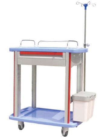ABS body, metal ball bearing rail, C-aluminum columns, plastic-steel columns, dust basket, concave top covered with transparent soft plastic glass, lock, IV pole, 1 big ABS drawer each inner with partitions can be well organized, drawer can be repositioned easily, luxurious noiseless casters.